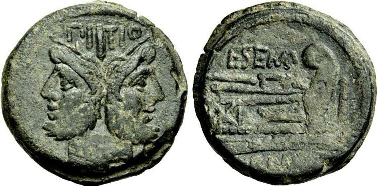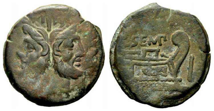 L. Sempr Pitio, Æ as, (24.54g) 148 BC, Head of Janus, PI TIO above, either side of large I. / Prow right, L SEMP above, I before, ROMA below. Cr216/2a.