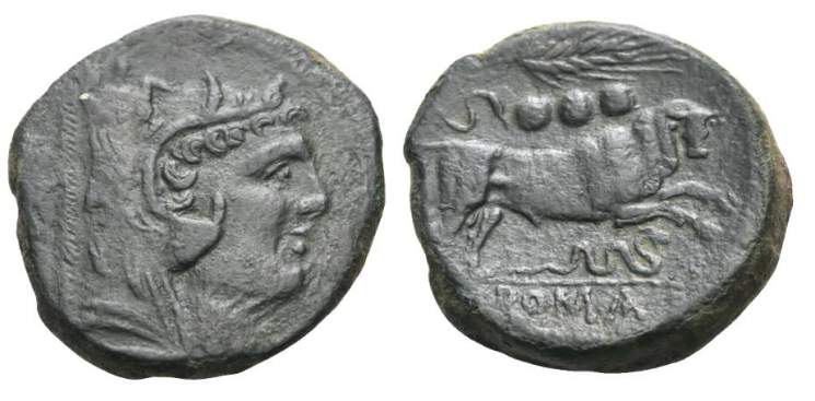 Anonymous. 211-210 BC. Æ Quadrans. Sicilian mint. Head of Hercules right, in boar’s skin; three pellets behind / Bull charging right; grain ear & three pellets above, snake below, ROMA in ex. BMCRR 140.
