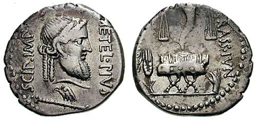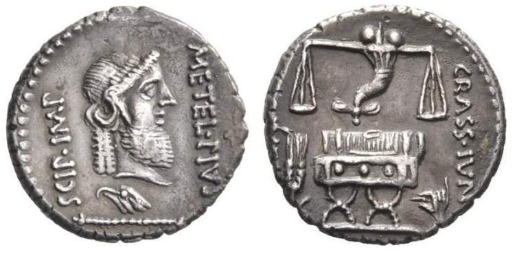 Q Metellius Pius Scipio Denarius. 46 BC. METEL PIVS SCIP IMP, head of Jupiter right, eagle's head and sceptre below / CRASS IVN LEG PRO P R, curile chair between corn ear a& carnyx, cornucopiae supporting scales. Cr460/2, Syd 1048.