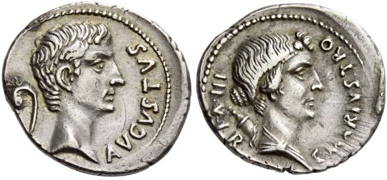Augustus & Julia denarius, AVGVSTVS Bare head of Augustus right, lituus behind. / C MARIVS TRO III [VI]R Diademed and draped bust right of Julia as Diana, quiver over shoulder. RSC1.