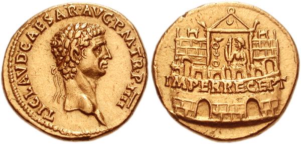 Claudius AV Aureus. Struck AD 44/5. TI CLAVD CAESAR AVG P M TR P IIII, laureate head right / IMPER RECEPT across rim of crenulated wall with two arched entries, surmounted by distyle structure with Claudius within, seated left, holding sceptre & facing signum. Calicó 361a.