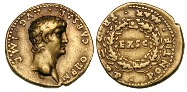 Nero AV Aureus. 55-56 AD. NERO CAESAR AVG IMP, bare head right / PONTIF MAX TR P II P P, wreath containing EX S C. BMC 9.