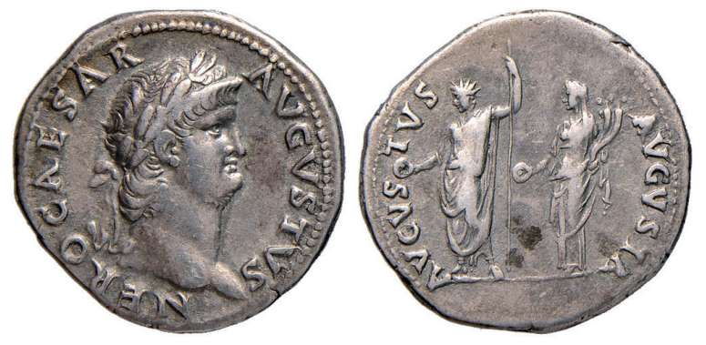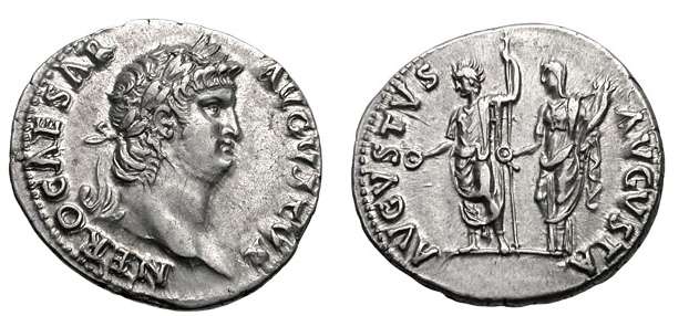 Nero Denarius. NERO CAESAR AVGVSTVS, laureate head right / AVGVSTVS AVGVSTA, Nero, radiate, standing left holding patera and sceptre; to right, Empress Poppaea standing left holding patera and cornucopiae.