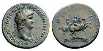 Nero AE Sestertius. ca 64 AD. NERO CLAVDIVS CAESAR AVG GER P M TR P IMP P P,laure bust right, wearing aegis / S-C, DECVRSIO below, Nero on horseback right, holding spear; behind him, soldier on horseback right, holding vexillum. Cohen 83.