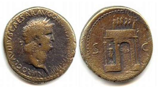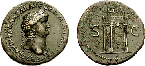 Nero AE Sestertius. ca 64 AD. NERO CLAVDIVS CAESAR AVG GERM P M TR P IMP P P, laureate bust right wearing aegis / S-C, Nero's triumphal arch, surmounted by quadriga, statue of Mars between columns. Cohen 308.