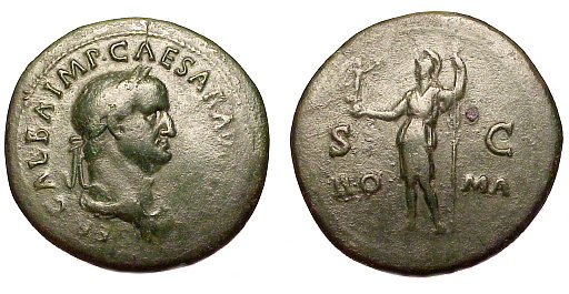 Galba AE sestertius. Laureate head right / Roma in crested helmet standing left holding Nike & sceptre, S-C and RO-MA to either side.