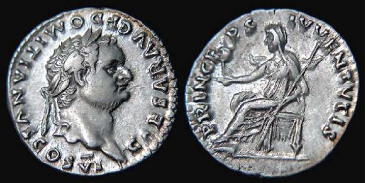 Domitian Denarius. CAESAR AVG F DOMITIANVS COS VI, laureate head right / PRINCEPS IVVENTVTIS, Vesta seated left, holding palladium and sceptre. RSC 378.
