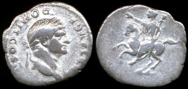 Domitian Denarius. CAES AVG F DOMIT COS II, laureate head right / Domitian riding horse left, raising hand & holding sceptre surmounted by a human head. RSC 664.