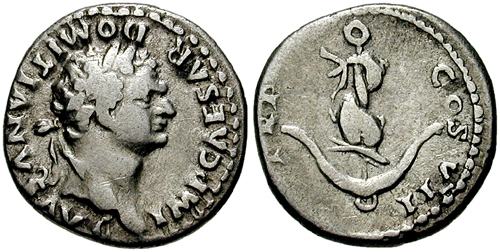 Domitian, as Augustus, AR Denarius. Rome mint, 81 AD. IMP CAESAR DOMITIANVS AVG, laureate head right / TR P COS VII, dolphin entwined around anchor. RSC 552.