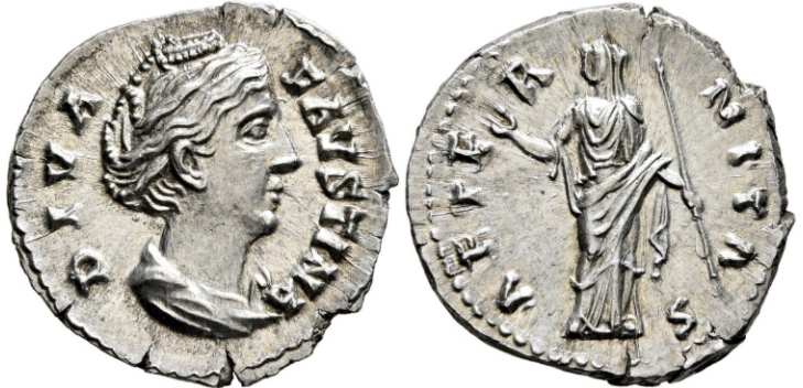 Diva Faustina Senior Denarius. DIVA FAVSTINA, draped bust right / AETERNITAS, Juno standing left, hand raised, holding sceptre. RSC 26.