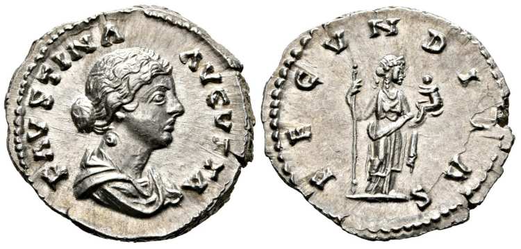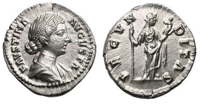 Faustina II Denarius. FAVSTINA AVGVSTA, draped bust right, sometimes diademed / FECVNDITAS, Fecunditas standing right, holding sceptre and infant. RIC 677, RSC 99, BMCRE 91.