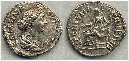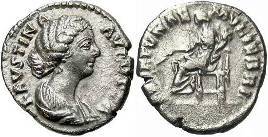 Faustina Jr Denarius. FAVSTINA AVGVSTA, draped bust right / FORTVNAE MVLIEBRI, Womanly Fortune seated left on throne with back, holding rudder on globe & cornucopiae. RSC 107.