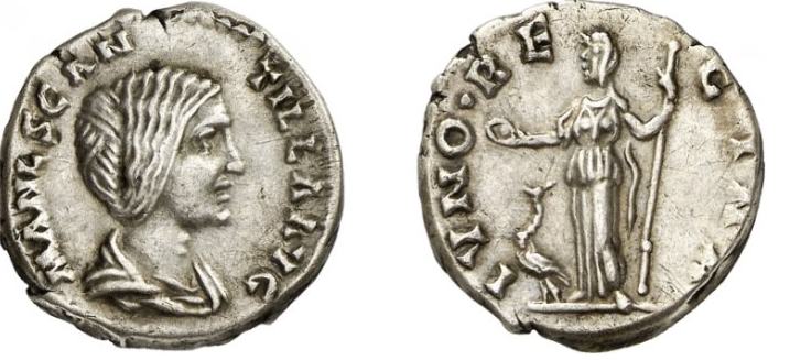 Manlia Scantilla Denarius. MANLIA SCANTILLA AVG, draped bust right / IVNO REGINA, Juno standing left, holding patera & sceptre, peacock at feet standing left. RSC 2.