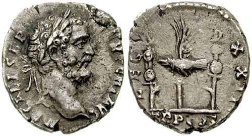 Septimius Severus AR Legionary Denarius. Struck 193 AD. IMP CAE L SEP SEV PERT AVG, laureate head right / LEG XXII, TR P COS in exergue, legionary eagle on low perch left between two standards. RSC 276.