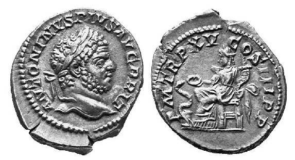 Caracalla Denarius. 212 AD. ANTONINVS PIVS AVG BRIT, laureate head right / PM TR P XV COS III PP, Salus seated left, feeding snake from patera & holding cornucopiae. RSC 206.