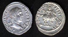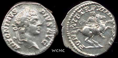 Caracalla Denarius. 206 AD. ANTONINVS PIVS AVG, laureate head right / PONTIF TR P VIIII COS II, Caracalla on horse galloping right, holding spear at rest. RSC 427.