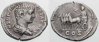 Geta, as Caesar, Denarius. 203 AD. P SEPTIMIVS GETA CAES, draped bust right, seen from behind / Geta driving triumphal quadriga left, holding sceptre (tipped with an oil lamp?), COS in ex. RSC 28.