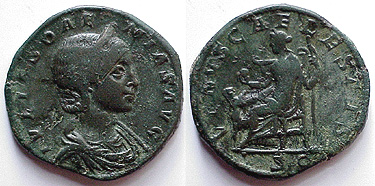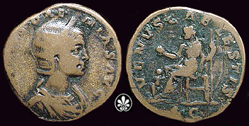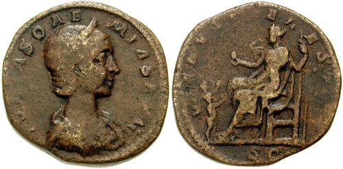 Julia Soemias AE Sestertius. 220 AD. IVLIA SOAEMIAS AVG, diademed draped bust right / VENVS CAELESTIS, Venus standing left, holding apple & sceptre, child at feet, star in right field, SC in ex. RSC 18.