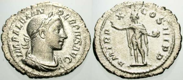 Severus Alexander Denarius. 231 AD. IMP ALEXANDER PIVS AVG, laureate, draped & cuirassed bust right / P M TR P X COS III P P, Sol, radiate. standing left with raised hand & globe. RSC 411.