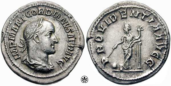 Gordian II Denarius. IMP M ANT GORDIANVS AFR AVG, laureate, draped, & cuirassed bust right / PROVIDENTIA AVGG, Providentia standing left with cornucopiae & wand over globe, leaning on column. RIC 1, RSC 5.
