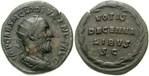 Pupienus AE Dupondius. IMP CAES M CLOD PVPIENVS AVG, radiate, draped and cuirassed bust right / VOTIS/DECENNA/LIBVS/SC within wreath. Cohen -.