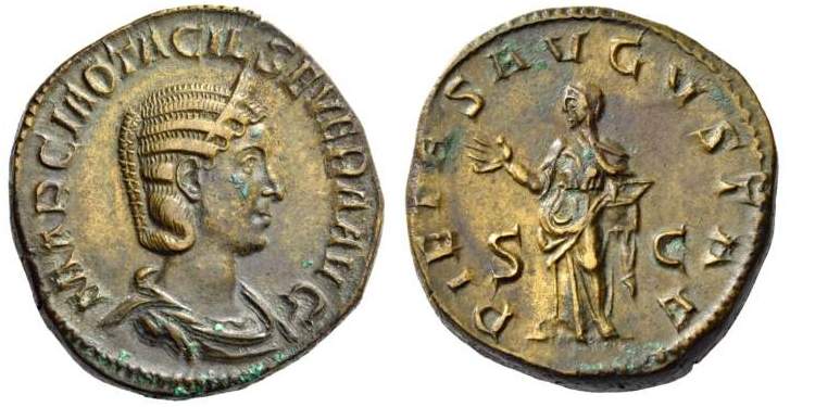 Otacilia Severa AE Sestertius. MARCIA OTACIL SEVERA AVG, diademed and draped bust right / PIETAS AVGVSTAE S-C, Pietas standing, holding corn ears. RIC 208a, Cohen 46.