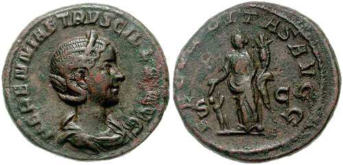 Herennia Etruscilla AE As. HERENNIA ETRVSCILLA AVG, diademed, draped bust right / FECVNDITAS AVG S-C, Fecunditas standing left, holding cornucopia and placing hand over child. Cohen 13.